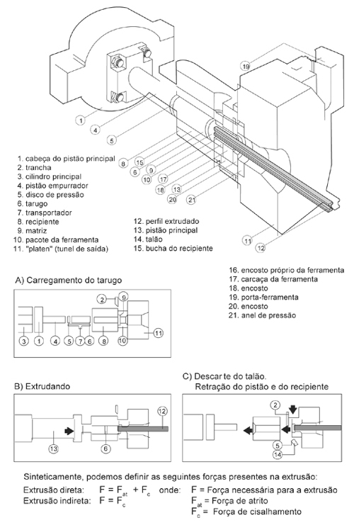 É um processo de transformação termomecânica no qual um tarugo de metal é reduzido em sua seção transversal quando forçado a fluir através do orifício de uma matriz (ferramenta), sob o efeito de altas pressões e temperatura. Como uma pasta de dente sendo expelida para fora de seu tubo.